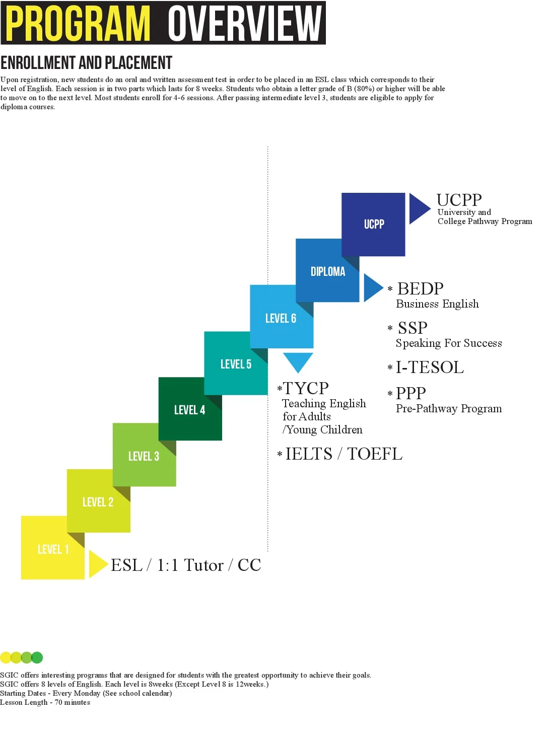 SGIC アドミッション テスト 70%、または SGIC、または TOEIC 601、 または TOEFL iBT 34、または IELTS 4.5 + で中級英語レベル 5 を完了 (口頭テストが必要) |
