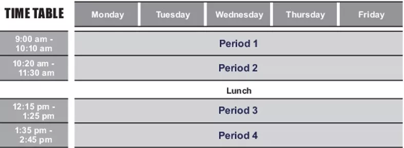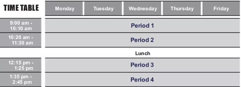 | クラス人数 | 平均 12 ~ 14 人 (最大 16 人) |