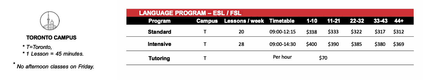 トロントキャンパスでは一般英語プログラムに加えて試験対策プログラム、翻訳通訳プログラム、ビジネス英語プログラムといった専門性の高い授業を執り行っています。こちらのレベルチャートを参考に以下の開講プログラム概要をご覧ください!