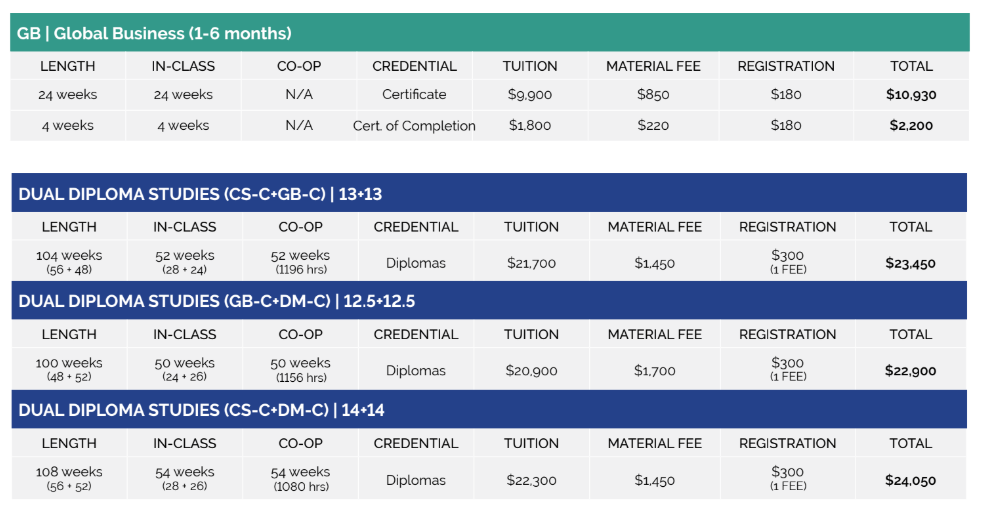 | 入学要件 | 医療保険証明書、セカンダリースクール卒業証書(12 年生)・成人学生・英語で授業をする学部の学位を所持している者、満18歳以上、当校の入学試験に合格、SSLC ESL SF4/SC7-8・IELTS 5.5・TOEFL ibt 46・TOEIC 625・Duolingo 85の証明ができること(*コープ①の場合は条件が厳しくなります。) |