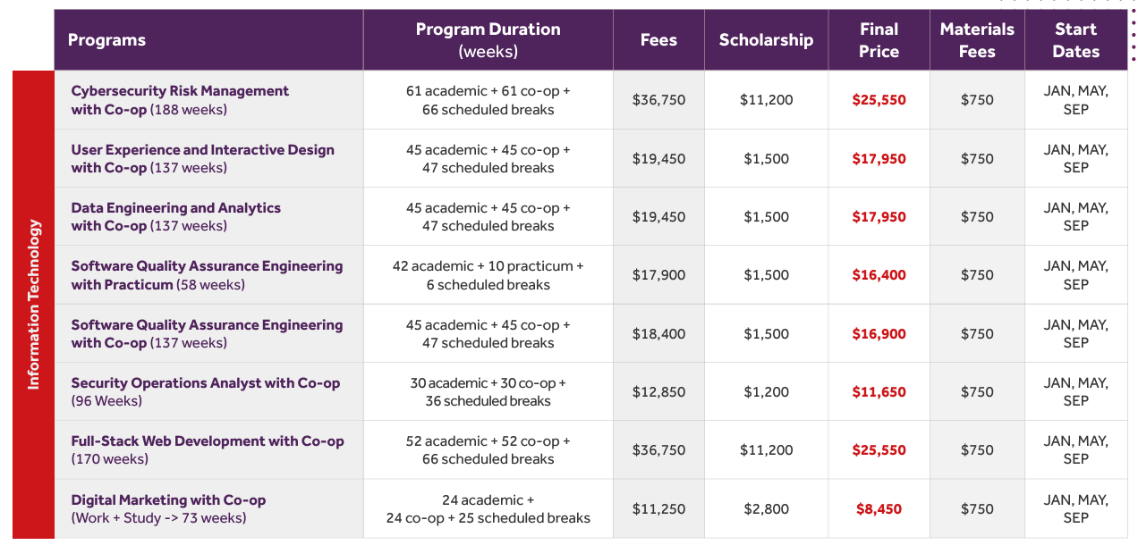画像引用:CCTB(Canadian College of Technology and Business)「Pricelist & Admission Requirements」